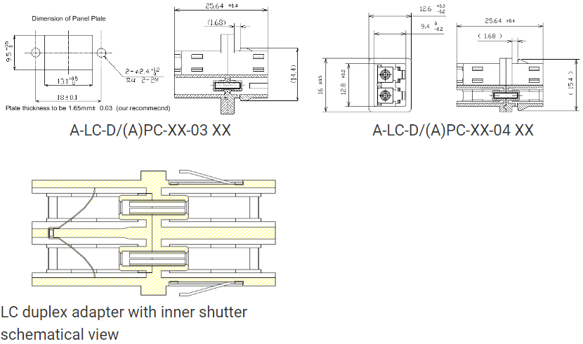 The innovative LC design features a Small Form Factor (SFF) that is only half the size of current industry standards, with user-friendly functionalities redefined. The LC meets the specifications of EIA/TIA 568A, FOCIS 10, and IEC 11801 for optical performance and compatibility. The LC duplex connector fits into the SC standard cutout. Two different versions are available: – Duplex-Adapter – Quad-Adapter