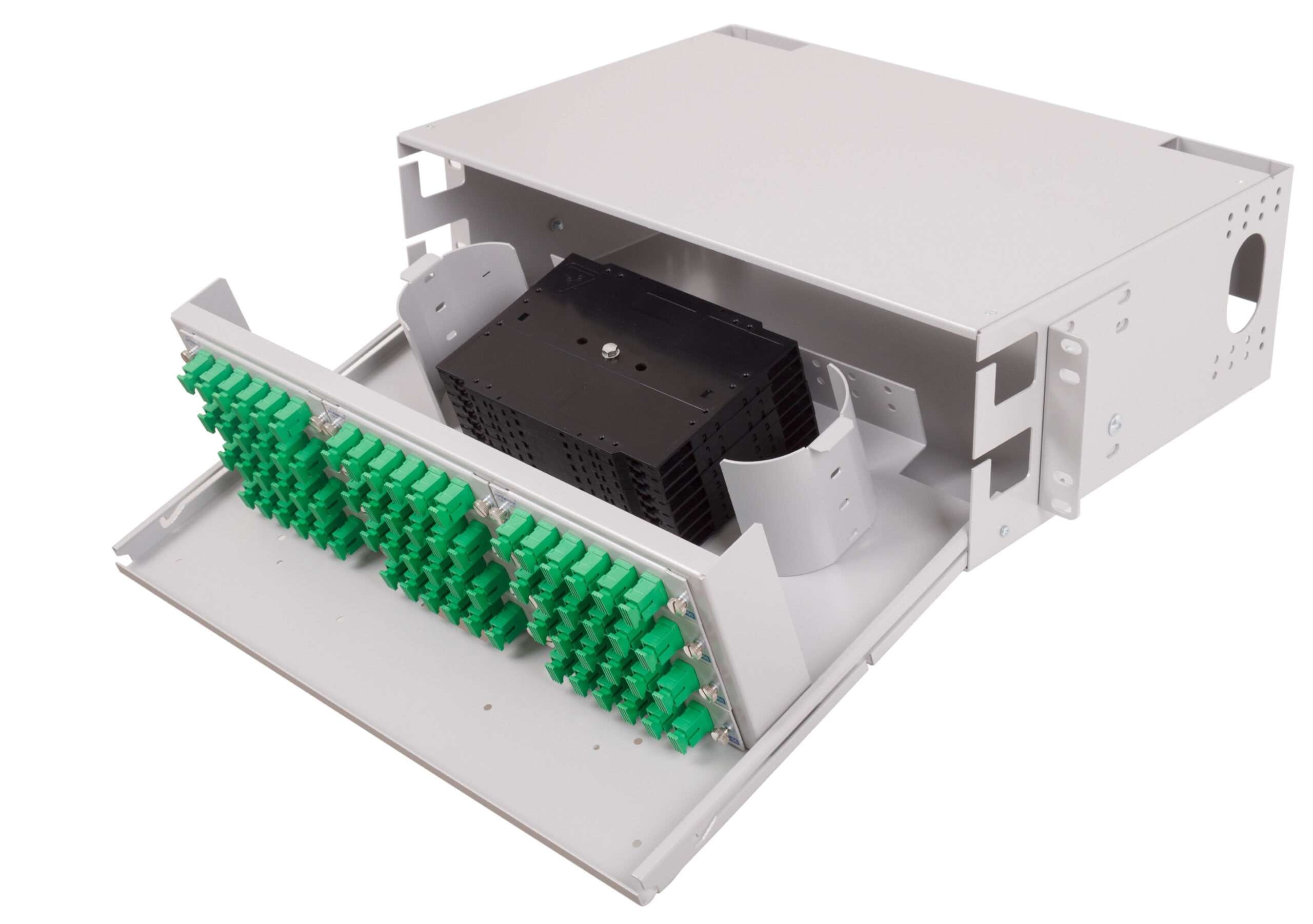 The OFDU-TS cabinet is based on universal optical distribution frames. The uniform modular system allows for easy reconfiguration and can be expanded according to the operator’s needs. The OFDU-TS offers splicing and termination in a convenient housing unit. It terminates up to 192 fibers in a 3U distribution frame and can accommodate up to 12 snap-in coupling fields or pre-wired cassettes. The extendable and foldable shelf provides unrestricted access to the splice area and termination fields from the front, back, and top. Various types of splice cassettes can be used.