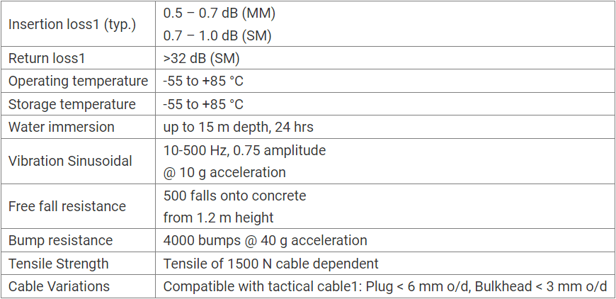 The OPTOKON HMA optical modules are designed to connect nodes of a tactical network using fiber optic cables. The “Expanded Beam Technology” employed preserves all the advantages of signal transmission over optical fibers in harsh environmental conditions. The precise optical alignment system benefits from the well-established Expanded Beam Technology in the industry, making it immune to water, mud, dust, oil, and other contaminants. The HMA hermaphrodite coupling eliminates the need for adapters and male or female counterparts. Hermaphrodite housings enable quick deployment and create low-loss single-mode, multi-mode, and hybrid daisy-chain connections in a variety of configurations, ranging from simplex fibers to copper hybrids. The OPTOKON HMA is ideal for extreme environmental conditions where low maintenance and quick repairs are required. The connectors are uniquely field-installable and can be quickly repaired on-site. There are two different types of OPTOKON HMA connection modules: a) Military tactical cable type LD with OPTOKON HMA connectors on both ends. b) Hybrid connection module OPTOKON HMA for standard fiber optic connections (FC, SC, ST, LC, etc.).