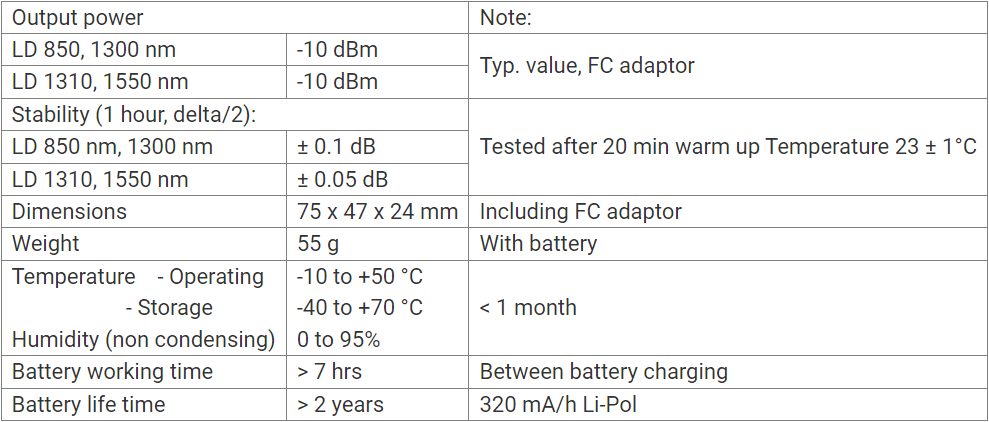 The optical light source LS-215E is a compact and cost-effective device that meets all essential technical requirements for field instruments. It operates at wavelengths of 850/1300 nm for multimode or 1310/1550 nm for singlemode applications. The rechargeable battery ensures long operation with a minimum lifespan of 2 years. The batteries can be conveniently recharged via a USB port or an external AC/DC adapter. The versatile output connector simplifies the integration of commonly used optical adapters (FC, SC, or ST) in telecommunications, data, and industrial networks. This output connector is specifically designed for connecting connectors with a polished PC surface. The LS-215E light source can work together with the PM-215E, which shares the same compact design as the smallest optical power meter. Together, they enable insertion loss measurements and evaluation of the power budget in optical networks. The tester is equipped with a USB port for convenient battery recharging.