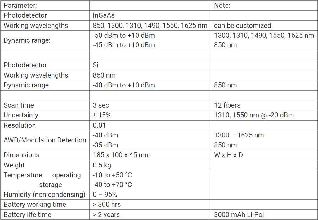 - Measures power in both SM (Single-Mode) and MM (Multi-Mode) fibers