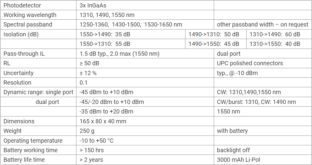 The optical power meter PM-830-FTTX is designed for the simultaneous measurement and display of all signals – voice, data, and video. The tester can be used as a portable power meter or as a USB probe, part of a test workstation. The FTTX tester is also perfect for testing PON services during activation and maintenance. The storage capacity allows for the storage and upload of up to 2000 measurements. The stored data can be easily exported to Excel, Word, or any other application. Two versions of the PM-830-FTTX meter are available: Single-Port: The version with a single input port – designed for measurements at the ends of optical fibers, requires the disconnection of the active device from the optical fibers for measurements. Dual-Port: The version with two optical ports – the dual-port tester with optical IN/OUT ports allows measurements of uninterrupted optical fibers with the connected active device, pass-through test mode. The PM-830-G1 tester is optimized for testing GEPON (Gigabit EPON) and GPON standards, with upstream transmission speeds of up to 1.25 Gbps. The 1310 nm channel enables accurate power measurements of burst upstream PON signals. The interchangeable plug/adapter design allows for easy swapping of optical PC or APC connectors (FC, SC) and easy cleaning of the output connector ferrule after removing the plug adapter. LC/PC and LC/APC are also available.