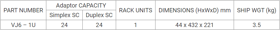 The VJ6 housing represents a compact, cost-effective solution for fiber optic cable termination. The VJ6 series is ideally suited for rack mounting in tight spaces such as equipment enclosures, where rack space is limited. The housing is delivered unpopulated. The pull-out shelf allows easy access to the splice area for reconfiguring the optical network during operation and prevents damage to the fibers before they are routed into the adapters. Up to 4 splice cassettes can be placed on the tray. The maximum fiber capacity depends on the number of optical adapters (24 or 48 fibers). The VJ6 housing is made from aluminum alloy 5754, which offers excellent corrosion resistance and very high strength.